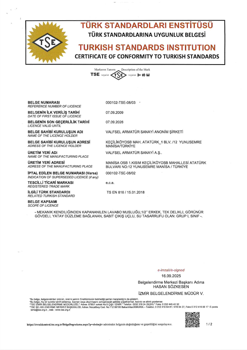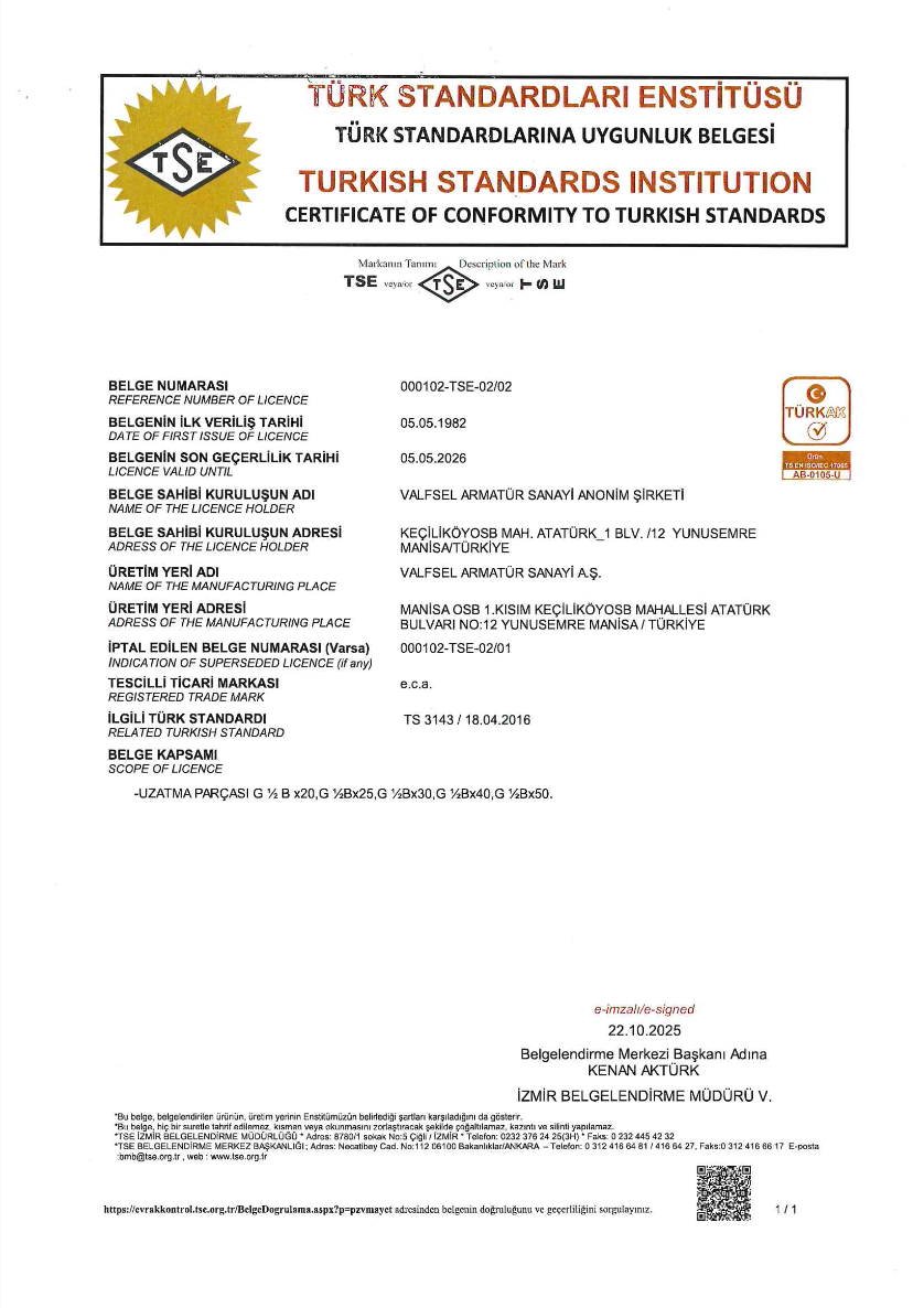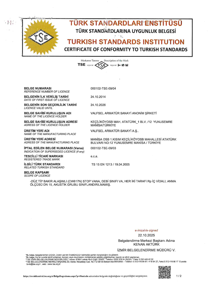 TS 15 EN 1213 - Ankastre Ara Kesme Valfleri