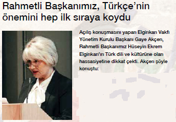“Elginkan Topluluğu Değişmez Başkanımız Merhum Hüseyin Ekrem Elginkan’ın bizlere bıraktığı vasiyetlerden birisi; ‘kültür değerlerimizi, tarihimizde bizi büyüten örf âdet ve manevi değerlerimizi ve Türkçemizi araştırmak, araştırmaları desteklemek, korumak, yaşatmak ve tanıtmak’ olmuştur. Kurucumuz ve Değişmez Başkanımız bir yandan Türkiye’nin kültürel mirasını ve değerlerini özveriyle korumayı, yaşatmayı ve desteklemeyi; bir yandan da nitelikli işgücünün yetiştirilmesini sağlayacak eğitim kurumları açarak, bunu tüm yurt geneline yaymayı hedeflemişti. Vakıf Kurucumuz olan Hüseyin Ekrem Elginkan, mühendisliğinin yanında, Türkçe’ye ve güzel konuşmaya son derece önem veren bir liderdi.