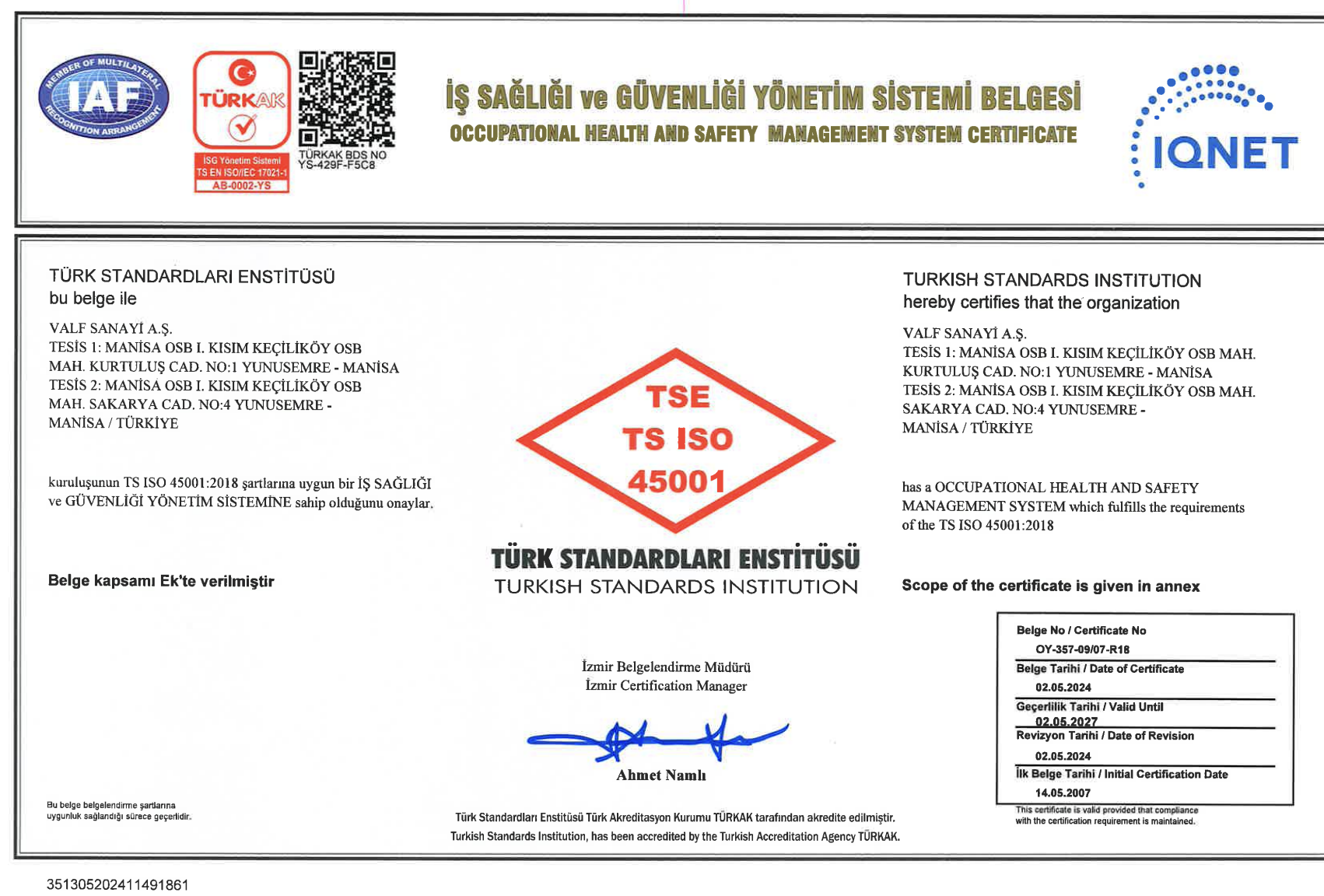 ISO 45001 İş Sağlığı ve Güvenliği Yönetim Sistemi Sertifikası
