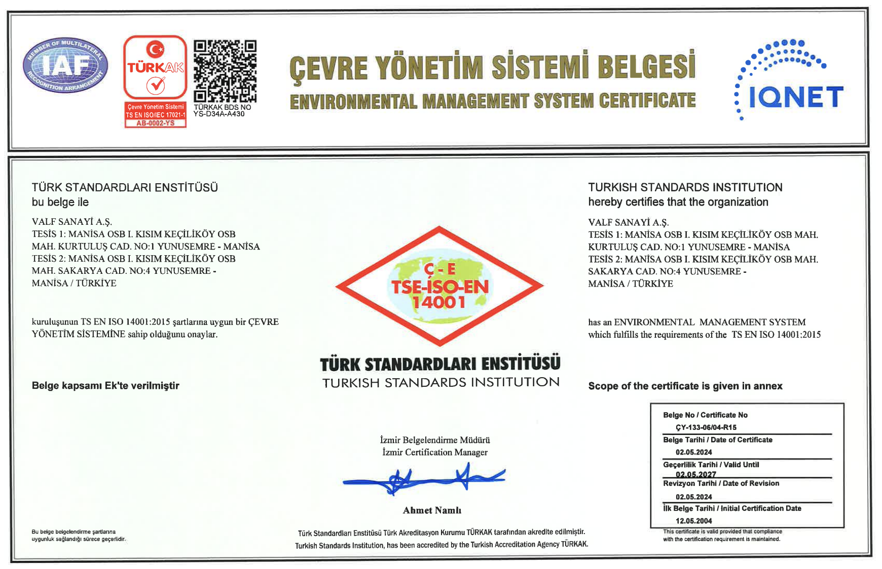 ISO 14001-2015 Çevre Yönetim Sistemi Sertifikası
