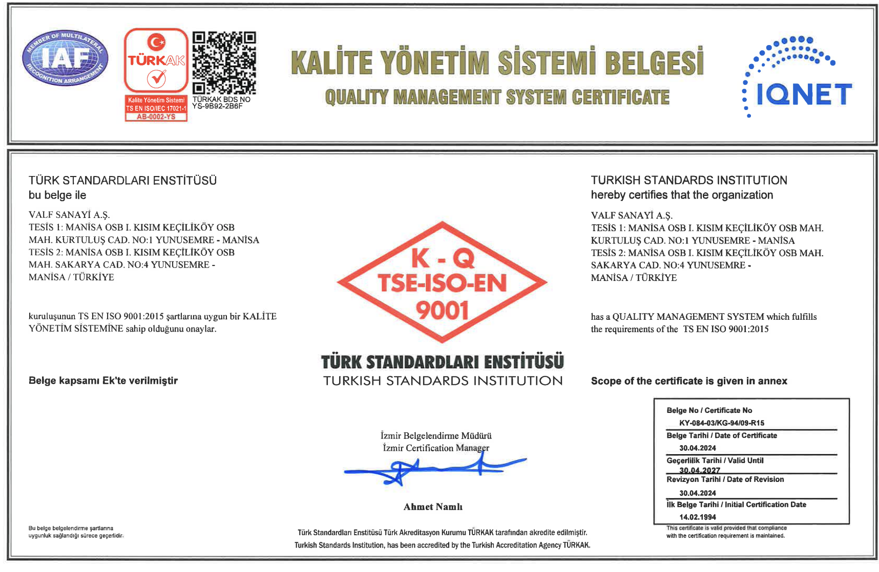 ISO 9001-2015 Kalite Yönetim Sistemi Sertifikası